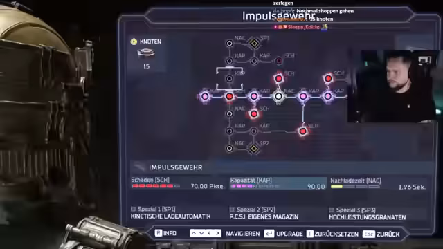 02:53:48Auf dem Weg zum finalen Boss, dem HiveMind, versucht der Streamer, sein Inventar durch den Verkauf von Überflüssigem zu optimieren. Er konzentriert sich auf das Plasma-Cutter- und Impulsgewehr, da er für den Ripper keine große Wirksamkeit erwartet. Er stellt fest, dass er bereits die meisten wichtigen Upgrades erworben hat und nur noch Munitions-Kapazitäten maximiert, um für den bevorstehenden Kampf gewappnet zu sein.