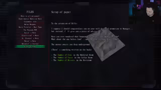 01:59:22Die Streamerin entdeckt Notizen über den Peacock Pub, die die Geschichte des Ortes beschreiben. Er wurde 1892 erbaut, diente im Zweiten Weltkrieg als Operationsbasis und wurde 1985 von einem neuen Besitzer wiedereröffnet. Sie findet einen Hinweis auf eine Person namens Octavia Blade, eine Autorin, die auch im Spiel erwähnt wird. Sie erfährt, dass es ein True Ending gibt, wenn man bestimmte Medikamente nicht einnimmt.