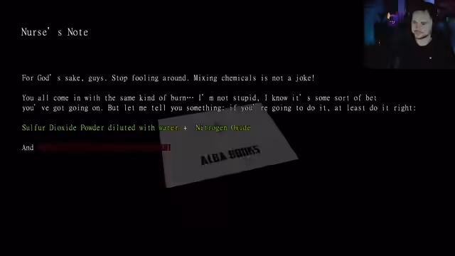 04:58:24Nach dem Kampf muss die Streamerin ein Chemie-Rätsel lösen. Sie besitzt Chemikalien wie Stickstoffoxid und Schwefeldioxid und muss diese mit Wasser verdünnen. Nach einigem Suchen und einem möglichen Game over wegen zu wenig Munition, findet sie im Nurse Room eine Flasche und im Ocean Room Wasser, um die Säure zu herstellen und das Schloss zu öffnen.