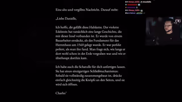 06:31:56Pistolenteile werden gefunden, die zur Verbesserung der Waffe dienen. Es wird ein Wetzstein entdeckt, der die Schärfe des Messers wiederherstellt. Der Streamer fühlt sich an eine Black Mirror-Folge erinnert. Es wird nach einem Safe Room gesucht, nachdem alle Hinweise genutzt wurden. Ein Dietrich wird gefunden, und es werden verschlossene Türen geöffnet. Eine Nachricht des Hausmeisters Alexander wird gefunden, die auf etwas Verdächtiges hinter einem Gemälde hindeutet. Der Streamer rüstet die Schrotflinte auf und erkundet den Keller. Es wird ein neues Scary Movie angekündigt, und der Streamer erinnert sich an die ersten Teile der Reihe. Im Dialog wird erwähnt, dass William nie gefunden wurde, aber plötzlich wieder auftauchte, und dass der Vater tot ist. Der Streamer betont, dass es in dem Spiel um Videospiele geht und bittet darum, das Spielerlebnis nicht zu ruinieren. Der Synchronsprecher wird für seinen Einsatz gelobt. Der Streamer findet Gefallen an dem Spiel und seiner Abwechslung. Ein Kupferschlüssel wird gefunden, nachdem ein Stachelhieb erfolgreich überwunden wurde. Der Streamer schildert eine Szene, in der ein Porträt eine Gruppe von Menschen zeigt, die sich gegenseitig zerfleischen, und zitiert dazu einen Bibelvers über die Liebe. Es wird eine Notiz mit Schalen gefunden, die mit Blut durchtränkt ist und möglicherweise Buchstaben darstellt. Der Streamer stellt fest, dass es ihm psychisch nicht gut geht und sucht einen Safe Room. Es wird überlegt, ob es im Spiel Headshots gibt. Der Stream wird beendet, da der Streamer früh aufstehen muss, aber es wird ein Ausblick auf den nächsten Stream gegeben, in dem Metal Gear Solid 4 gespielt wird.