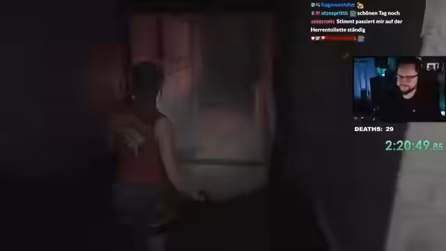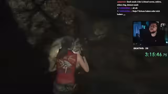 03:15:08Es wird über den weiteren Weg durch die Kanalisation gesprochen, der eigentlich im grünen Bereich sein sollte. Der Streamer liest eine übertriebene Beschreibung von einem Zuschauer vor, was ihm unangenehm ist. Es wird festgestellt, dass ein Bereich rot markiert ist, aber kein Item vorhanden ist. Der Streamer erinnert sich daran, dass nächste Woche Donnerstag ein Termin ansteht und ihm wird klar, dass er etwas vergessen hat. Beim Einführen einer Karte stirbt der Streamer unerwartet. Er beschwert sich über den plötzlichen Tod und die verschwendete Heilung. Es wird festgestellt, dass sich Mr. X in der Kanalisation versteckt hat. Der Streamer wird von Mr. X angegriffen und ist überrascht von dessen Geschwindigkeit. Es wird festgestellt, dass Mr. X eigentlich nicht über eine bestimmte Stelle kommen dürfte. Der Streamer wird von einem Licker angegriffen und benötigt viele Schüsse, um ihn zu besiegen. Es wird überlegt, ob eine leere Mülldose Loot enthält. Ein Pflanzenfuzzi und ein Hund tauchen auf. Der Streamer fragt sich, wie er die Situation bewältigen soll und wie viele Gegner es gibt.