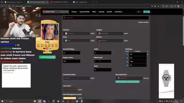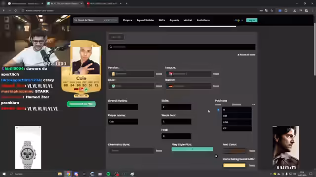 04:24:39Der letzte offene Platz im Team, der Sturm, wird mit Nahim „Sky“ besetzt. Seine Stats werden festgelegt: besonders hohes Tempo (87) und ein durchschnittlicher Schuss (82). Danach geht es wieder in den visuellen Editor, um Nahims Aussehen zu gestalten. Der Streamer unterbricht dies jedoch, um ein Quiz für den Chat einzuführen, bei dem die Viewer professionelle Fußballer anhand von Bildern identifizieren sollen. Dies dient als Unterhaltungselement, bevor die Erstellung der Karte fortgesetzt wird.