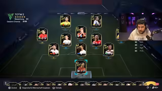 03:55:55Der Streamer präsentiert sein finales Team in FC26 nach einem Investment von 7.000 Euro und befindet sich bei etwa 6.100 Euro auf dem Konto. Er zeigt zunächst ein Best-of der bisher gezogenen Spieler und öffnet seine ersten Rivals Rewards, darunter ein Player Pick und diverse Boni. Bei der Suche nach den Rewards äußert er anfänglich Skepsis, ist aber dennoch optimistisch, gute Karten zu ziehen. Das Intro für den Hauptkanal-Chat wird kurz angesprochen.