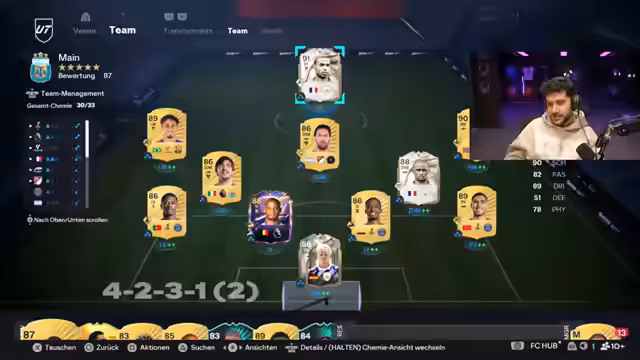 04:08:04Nach verschiedenen Pack-Openings, bei denen auch Körperteil-Openings thematisiert werden, konzentriert sich der Streamer auf den Aufbau seines Teams. Er erwirbt Spieler wie Gnola für 3 Millionen und Bless Matuidi für 930k, wobei er langfristige Wertsteigerungen der Spieler erwartet. Bei der Aufstellung und Formation zeigt er Unsicherheit und diskutiert mögliche Taktiken mit seinem Chat. Das Team soll für die anstehende Weekend League und Challenges optimiert werden.