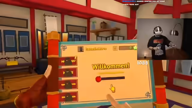 00:25:16Nach technischen Vorbereitungen und der Einrichtung der VR-Brille beginnt Hamid sein erstes VR-Spiel, Fruit Ninja. Er ist von der Immersion beeindruckt und zeigt seinem Setup im Raum, das den Zuschauern einen Blick in die VR-Welt ermöglicht. Das Spiel gestaltet sich für ihn jedoch anstrengend, da er sich ständig orientieren muss und die Controller ungewohnt sind.