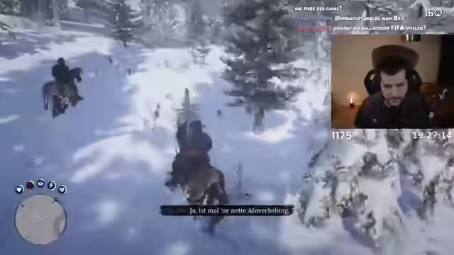 03:33:07Die erste Mission des Spiels ist eine ereignisreiche Flucht durch einen verschneiten Wald. Der Streamer und sein Team, zu dem auch die Charaktere John und Abigail gehören, werden von der verfeindeten Gang 'O'Driscolls' (ODs) verfolgt. Nach einem heftigen Schusswechsel, bei dem ein OD gefangen genommen wird, flieht das Team. Der Streamer kämpft mit den Steuerungselementen, insbesondere dem Nachladen der Waffe, und gerät in einen Hinterhalt mit Wölfen. In dieser Konfrontation erleidet er den ersten Charaktertod im Spiel, was eine Mission zur Überprüfung nach sich zieht. Danach geht es in ein Lager, wo plötzlich die Anführerin der ODs erscheint und eine brutale Konfrontation bevorsteht. Der Streamer plant, den Anführer als Geisel zu nehmen, was zu einer spannenden Konfrontation führt.