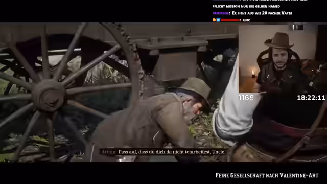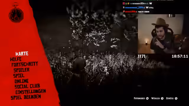 18:54:37Nach dem Bad nimmt der Streamer eine silberne Gürtelschnalle an sich, was die Polizei auf ihn aufmerksam macht. Er wird als Mordzeuge gesucht, kann fliehen und stellt fest, dass er nun auch ein neues Pferd besitzt. Auf der Flucht stößt er auf einen Mann der O'Driscoll-Bande und tötet diesen samt dessen Pferd, was zu einer weiteren Verfolgung führt. Er flieht sein Weg und kommentiert das als seinen 'Ninja-Weg'.