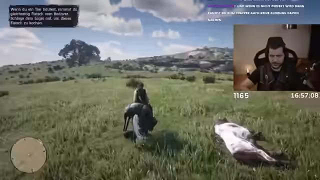 06:59:31Der Stream beginnt mit der Jagd auf Tiere. Nachdem ein Pferd aus Versehen getötet wurde, versucht der Spieler einen Steinbock zu erlegen, was jedoch misslingt. Die anfängliche Verwirrung über das Inventarsystem wird schnell behoben, und es wird erwähnt, dass Tiere in die Stadt getragen werden müssen, um sie zu verkaufen, was als nervig empfunden wird. Ein späterer Jagdversuch auf einen Bison scheitert, da das Fell durch zu viele Schüsse beeinträchtigt wird, was zu Frustration führt. Der Spieler entscheidet, für den Moment auf die Jagd zu verzichten und stattdessen etwas zu essen, zeigt aber weiterhin das Verlangen nach einem besseren Tier.