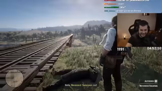 19:04:48Eine neue Mission beginnt, bei der der Streamer Reverend Swanson retten soll. Er findet den Reverend, der von Sheriffs bedroht wird und flieht. In einem dramatischen Verfolgungsjagd durch eine Ortschaft gelingt es dem Streamer, den Reverend zu retten, kurz bevor ein Zug ihn hätte überfahren können. Anschließend bringen sie den Reverend sicher zurück ins Lager, wo die Mission erfolgreich abgeschlossen wird.
