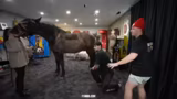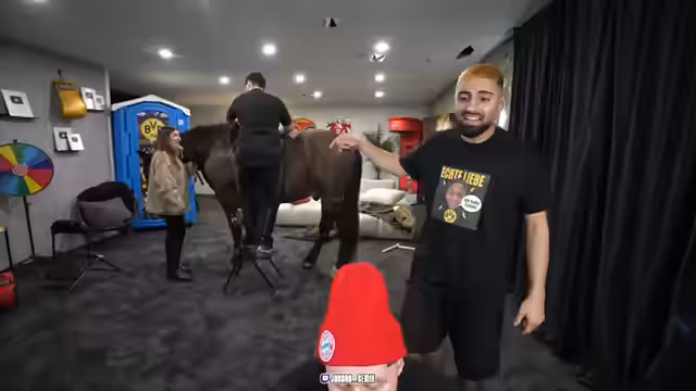 00:14:36Der geplante Überraschungsgast ist ein Pferd namens Rocco, das im Stream-Studio eintrifft. Jordan und Semih äußern zunächst große Vorsicht und Angst vor dem Tier. Semih, mutiger als Jordan, versucht, auf Rocco zu steigen, während andere Teilnehmer wie Sammy helfen. Rocco zeigt sich unruhig und will den Futternehmen, was die Situation unvorhersehbar macht.