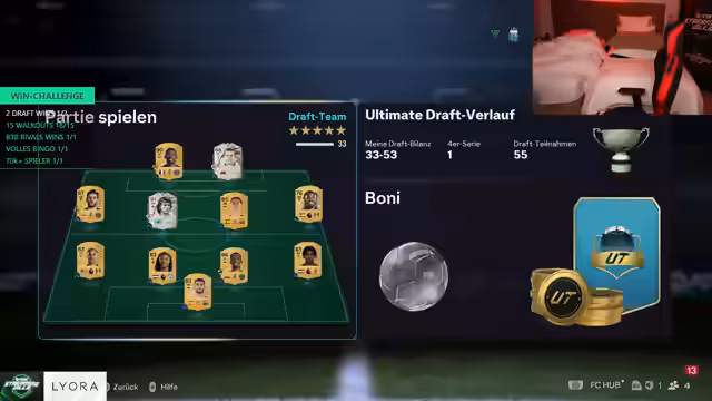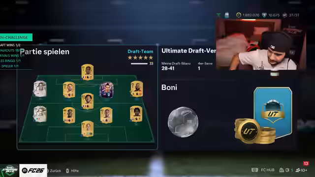10:28:57Eine neue Runde im Draft beginnt mit einer vielversprechenden Verteidigung aus Ferdinand und Militao. Trotzdem ist der Streamer unzufrieden mit seiner Spielweise und beschreibt sich als einen Sack voller Scheiße. Er analysiert die Spielmechaniken und kommt zu dem Schluss, dass Draft stark vom Glück abhängt, da man gegen zu starke oder zu schwache Gegner gelangen kann. Die Frustration über Bouncebacks und unfaire Spielzüge ist weiterhin präsent.