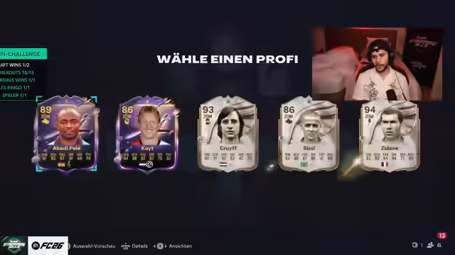 Eine anspruchsvolle Herausforderung in EA Sports FC 26 wurde gestartet. An der Challenge nehmen Personen wie Willi, Eli und Sidney teil, um Draftsiege zu sammeln. Der Fokus liegt darauf, die verbleibenden Draftsiege zu holen. Ein Teilnehmer berichtet, dass er bereits sehr lange gespielt hat und bis in die Morgenstunden aktiv war.