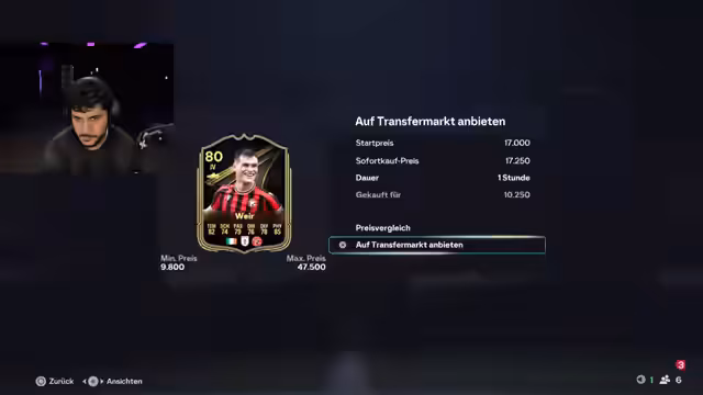 05:50:31Der Streamer gibt der Community konkrete Ratschläge zur UV-Liste Taktik und rät ihnen, zuerst zu beobachten, wie es bei ihm funktioniert. Er erklärt, dass man theoretisch jeden Spieler wieder nachkaufen kann, wenn er verkauft wurde, und so profitabel handelt. Er plant, diese Technik in zukünftigen Streams weiter zu demonstrieren und wechselt dann zu seinem zweiten Account, um sich für die Weekend League zu qualifizieren. Er erwähnt, dass er dort einen S raren Spieler gezogen hat.