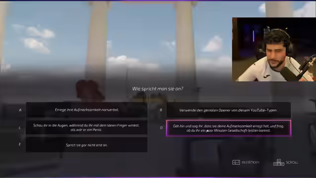 03:23:23Der Streamer interagiert mit dem neuen Charakter Michael und gibt Ratschläge, wie man westliche Frauen anspricht. Er betont, dass Asiaten selbstbewusst sein sollten und kulturelle Klischees nutzen, um Interesse zu wecken. Der Chat liefert Ideen für Flirttechniken, während der Streamer versucht, die Konversation in eine romantische Richtung zu lenken, indem er Themen wie Musik-Events und persönliche Interessen anspricht. Es wird diskutiert, wie man direkte Komplimente macht und eine Verbindung aufbaut.