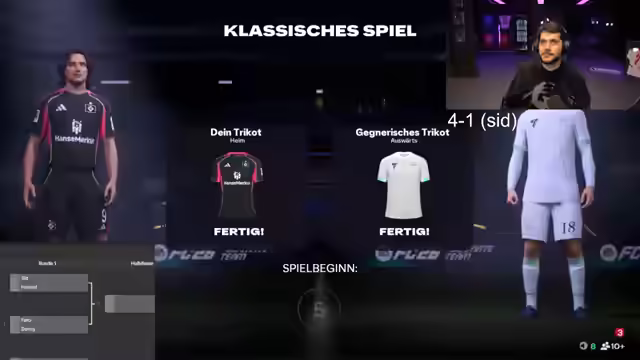 02:41:12Es wird eine humorvolle Bemerkung über Erling Braut Haaland gemacht. Anschließend werden drei Spieler hervorgehoben, die im Turnier besonders gut performen: Franz Beckenbauer, Barnes und Bornmatti. Es wird erklärt, dass zwei Spiele gespielt werden und die Ergebnisse zusammengerechnet werden. Es wird nach einem Blitz-KO gefragt, um nicht zwei Spiele gegen Sydney spielen zu müssen. Es wird versucht, Sydney zu einer entspannten Spielweise zu bewegen. Es wird festgestellt, dass er und Sydney nicht befreundet sind und er nicht weiß, wie man eine Einladung verschickt. Es wird über seinen amerikanischen Namen und seinen Vater gesprochen. Er bereitet sich mental auf eine mögliche Niederlage gegen Sydney vor und äußert sich besorgt über dessen Fähigkeiten. Er fragt Sydney, ob er sich für überdurchschnittlich intelligent hält und erzählt von seinem eigenen wiederholten Abiturversuch. Er scherzt darüber, Sydney abzulenken, um seine eigenen Chancen zu verbessern.