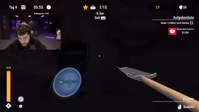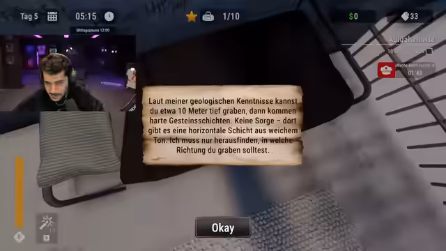 05:49:57Der Streamer bemerkt schnell, dass das Entkommen komplexer ist als angenommen. Statt nur nach unten zu graben, muss er auch mit einem Zeitsystem umgehen, das ihm nur wenige Sekunden für Aktivitäten gibt. Er beginnt, Gegenstände wie Lichter und Münzen zu sammeln und trifft auf einen mysteriösen Händler, der ihm Missionen gibt. Der Zeitdruck und die Notwendigkeit, Entscheidungen schnell zu treffen, sorgen für eine angespannte, aber fesselnde Atmosphäre.