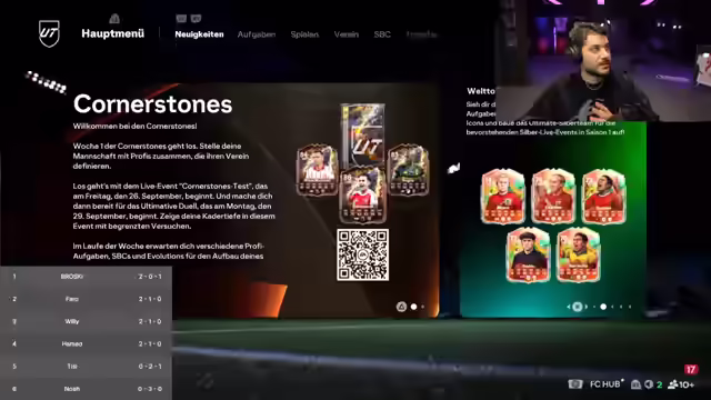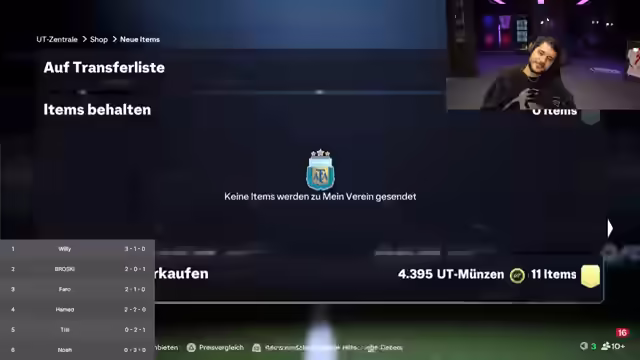 00:02:53Streamer kündigt an, am Eligella Cup teilzunehmen, einem Turnier mit einem Preispool von 2000 Euro. Er wird sich dabei von seinem Bruder, Gio Montana, das Team für das Turnier zusammenstellen lassen. Gian wird das Team aussuchen, inklusive Formation und Spielern, wobei Gian Zugriff auf die im Verein befindlichen Spieler hat und zusätzlich ein Budget von vier Millionen zur Verfügung steht, um weitere Spieler zu erwerben. Sollte das Team gewinnen, erhält Gian die Hälfte des Preisgeldes, also 1000 Euro. Die Teamzusammenstellung wird für ein TikTok-Video dokumentiert. Ziel ist es, ein starkes Team zu erstellen, mit dem Ziel, im Turnier erfolgreich zu sein und den Bruder am Gewinn zu beteiligen.