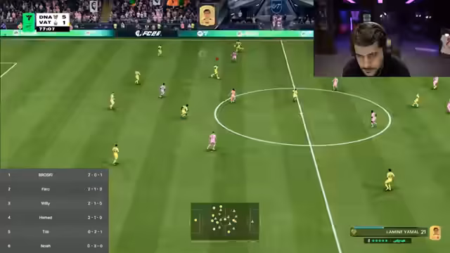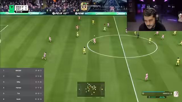 00:33:23Das erste Spiel gegen Faro verläuft für den Streamer desaströs. Faro dominiert das Spiel vollständig und führt schnell und klar. Der Streamer kann sich kaum am Ball behaupten und ist chancenlos. Er gibt zu, dass er das von Gian zusammengestellte Team noch nie gespielt hat und ist sichtlich frustriert und überfordert. Trotz der deutlichen Niederlage betont er, dass der Hauptzweck des Streams die Unterhaltung und der besondere Content durch die Teamfindung durch seinen Bruder ist, nicht der reine sportliche Erfolg.
