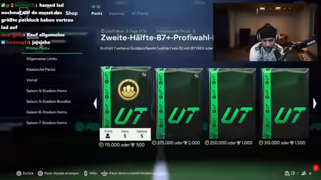 01:52:26Während des FIFA-Spiels verliert der Streamer gegen einen starken Gegner, ist aber trotz der Niederlage dankbar für die Packs, die er als Belohnung erhält. Nach dem Spiel entscheidet er sich, sein Team zu verbessern, und holt sich Vorschläge von seinen Zuschauern. Der Streamer öffnet mehrere Belohnungspacks, darunter Player Picks und einige andere Karten, und verkauft einige Spieler, um Coins für zukünftige Käufe zu sammeln.