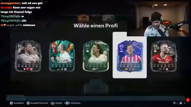01:45:02Nachdem er ein FIFA Draft-Spiel gestartet hat, wundert sich der Streamer über die Draft-Regeln und die unfaire Verteilung der Belohnungen. Er gewinnt knapp ein Spiel und erhält zwei Goldpacks sowie ein Silberprofi-Pack, ist aber unzufrieden mit den Belohnungen im Verhältnis zu der investierten Zeit. Der Streamer zeigt dann seine Draft-Auswahl von Spielern wie R9, Meliton, Hazard, Bernardo Silva und Alphonso Davies und baut sein Team für das bevorstehende Spiel auf.