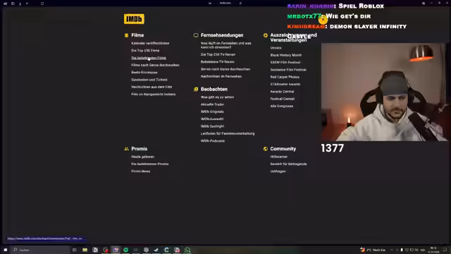 02:15:06Bevor es mit Poppy Playtime weitergeht, bittet der Streamer die Community um Empfehlungen für Filme oder Spiele, die einem bestimmten, düsteren Vibe entsprechen. Viele User schlagen Filme wie 'Pans Labyrinth' und 'Der Herr der Ringe' vor. Anschließend erstellt der Streamer spontan eine persönliche Top-Liste der besten Animations- und Anime-Serien. Er zählt Titel wie 'Breaking Bad', 'Attack on Titan' und 'Death Note' auf und bewertet sie anhand von IMDb-Bewertungen und eigenen Erfahrungen.