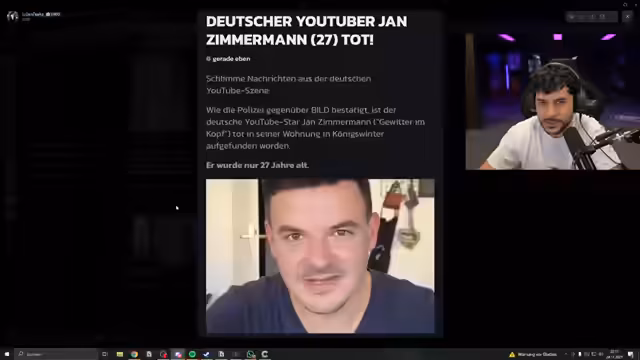 04:15:21Es werden traurige Nachrichten aus der deutschen YouTube-Szene geteilt. Der YouTuber Jan Zimmermann wurde in seiner Wohnung tot aufgefunden. Der Streamer drück sein Mitgefühl aus und erwähmt, dass Zimmermann öffentlich über seine Tourette-Erkrankung gesprochen hatte. Die genaue Todesursache ist zu diesem Zeitpunkt noch unbekannt.