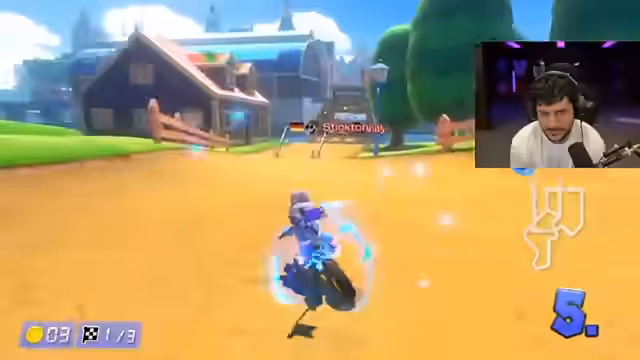 01:04:38Im weiteren Verlauf eines Rennens gelingt es dem Streamer, einen dramatischen Moment zu schaffen. Er überfährt den Konkurrenten Monte mehrfach, klaut dabei dessen Münzen und feuert Raketen ab. Dieser erfolgreiche Angriff wird im Chat und vom Streamer selbst als emotionaler Höhepunkt gefeiert und zeigt seine wachsende Konzentration und Aggressivität im Wettkampf.