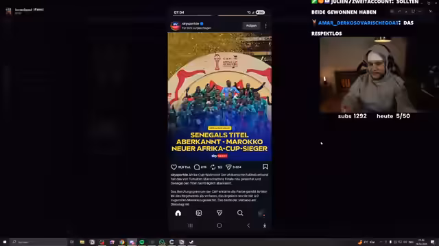 00:16:38Der Streamer diskutiert über eine sportliche Neuigkeit: den nachträglichen Titelgewinn von Marokko im Afrika-Cup. Senegal hatte das Finale ursprünglich mit 1:0 gewonnen, doch zwei Monate später wurde das Spiel nachträglich mit 3:0 für Marokko gewertet. Der Streamer ist verwundert und kritisiert die Entscheidung scharf, da sie aus seiner Sicht zu spät getroffen wurde und keine logische Erklärung hat. Er fühlt insbesondere mit dem senegaleschen Spieler Mané, der bereits mit dem Pokal gefeiert und Bilder gepostet hatte, dessen Titel ihm nun aber aberkannt wurde.
