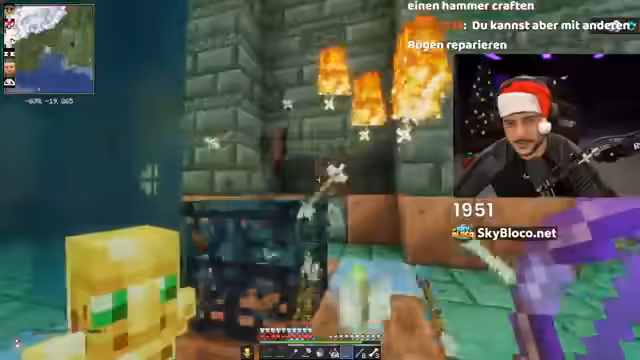 04:50:02Hamed baut seine Skyblock-Insel um, stellt aber fest, dass Bäume nicht wachsen – vermutlich wegen ungünstiger Platzierung. Beim Abbau von Cobblestone unter der Insel fallen erneut Items verloren, darunter eine Level-2-Pickaxe mit Mineral-Fortune-Enchantments. Die Diskussion mit Fabi ergibt, dass der Verlust beim Fallen wahrscheinlich ein verbliebener Bug ist, der 'Slash Repair' als Premium-Lösung vorsieht.
