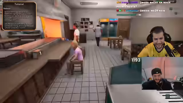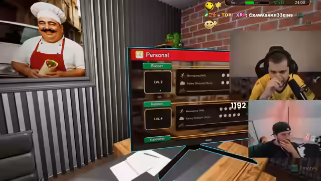 03:04:25Der Stream beginnt mit chaotischen Abläufen beim Dönern. Die Bearbeitung der Bestellungen gelingt nur mühsam, es kommt zu Fehlern wie dem Servieren von Schimmelwraps und Verwechslungen, bei denen Kunden falsche oder zu wenig Bestellte erhalten. Der erste zahlende Kunde ist zwar zufrieden, derWorkflow bleibt jedoch unkoordiniert. Der Bedarf an einem besseren Management wird deutlich, als es zu Verzögerungen und Unmut bei den Kunden kommt.
