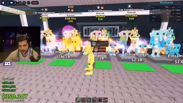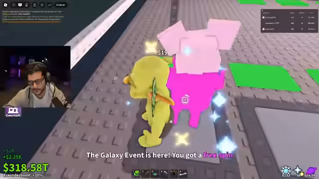 02:38:10Ein seltener Galaxy Taco Block wird gespawnt, den der Streamer unbedingt benötigt. Er koordiniert die Spieler, die gleichzeitig hin-und-her kaufen, um die Maschine freizubekommen. Ein zufällig gespawntes Nubini wird im Streamer Chat mit Rainbow-Handel gehandelt.