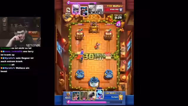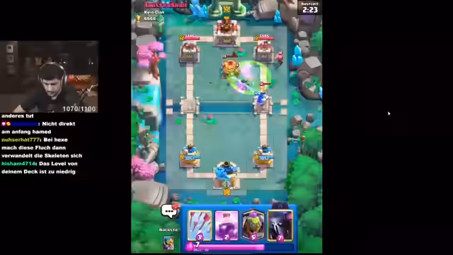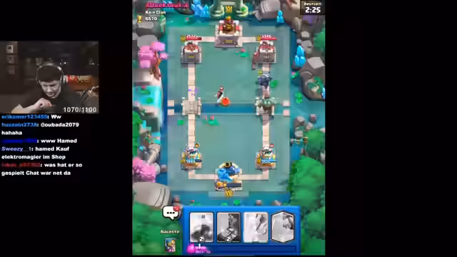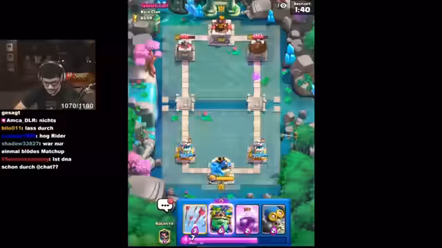 04:08:05Der Stream startet mit intensiven Gameplay-Momenten in Clash Royale. Der Spieler setzt eine Pekka-Karte Level 16 und diskutiert taktische Entscheidungen über die Platzierung seiner Karten. Er äußert Frustration über unnötige Fehler und betont die Wichtigkeit, seine Karten effektiver zu schützen. Der Fokus liegt auf der Verbesserung seiner Deck-Strategie und dem Management von Ressourcen wie Elixir.