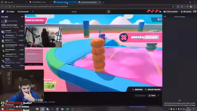 01:20:47Der Stream beginnt mit der Teilnahme an einem online Turnier, bei dem Teams in verschiedenen Spielen gegeneinander antreten. Nach technischen Startschwierigkeiten bei der Auswahl des richtigen Spielmodi, wird das Turnier fortgesetzt. Es wird in den ersten Runden intensiv um Siege gekämpft, wobei die Kommentatoren oft die Aufregung und das Gameplay beschreiben, wie z.B. in Runden von Fall Guys, in denen das Team nach und nach die Gegner eliminiert.