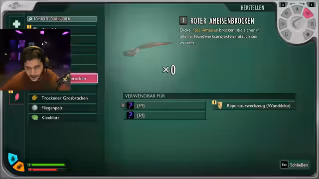 01:24:10Es werden Kieselsteine analysiert und verschiedene Gegenstände wie Kieselchensperr, Spröchlingbogen, Wegmarkierung, Spießgrill und Pflanzenfaser entdeckt. Es werden Pflanzenfasern gesammelt und ein grobes Seil hergestellt. Ein Speer wird gefunden. Es wird überlegt, eine Axt zu bauen, aber es gibt noch keine freigeschalteten Baupläne. Es werden Reste von Gegnern geerntet und analysiert, darunter Roter Ameisenbrocken und Lehm. Es kommt zu ersten Kämpfen mit Ameisen, und es wird festgestellt, dass die Charaktere Schaden erleiden. Ein Anruf von Burgle wird entgegengenommen, der um Reparatur bittet. Es werden Pilze gefunden und gegessen. Es wird Wasser getrunken, was zu Lebensverlust führt. Es wird Geld gefunden und über das Tragen diskutiert. Es kommt zu Kämpfen mit Ameisen, und es wird deren Loot gestohlen.