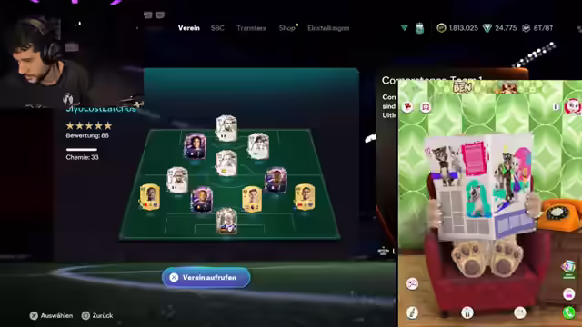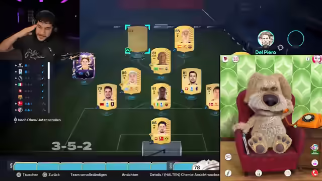 00:16:38Gemeinsam mit Talking Ben wird ein Draft durchgeführt, bei dem Ben die Formation aussuchen darf. Der Streamer versucht, Ben von einer Viererkette zu überzeugen, scheitert jedoch. Bei der Spielerauswahl kommt es zu weiteren Meinungsverschiedenheiten, insbesondere bei der Wahl zwischen Ronaldinho und Carol. Der Streamer versucht, die Entscheidungen von Ben zu beeinflussen, muss sich aber letztendlich dessen Willen beugen. Trotz der schwierigen Zusammenarbeit entsteht ein ungewöhnliches Team. Der Streamer fragt Talking Ben nach seiner Meinung zu verschiedenen Fußballvereinen und Nationalitäten, was zu einigen überraschenden Antworten führt. Am Ende des Drafts zeigt sich der Streamer unzufrieden mit dem Ergebnis, gibt aber sein Bestes, um das Spiel trotzdem zu gewinnen. Das Team hat eine Gesamtbewertung von 108, die Chemie ist schlecht, aber der Streamer will trotzdem sein Bestes geben. Er bittet Ben, ihm während des Spiels Tipps zu geben und sich zu konzentrieren.