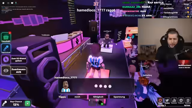 00:12:03Nachdem die technischen Probleme mit den Alerts vorerst gelöst sind, konzentriert sich der Streamer auf die Vorbereitung für die Roblox-Karaoke-Runde. Er sammelt im Chat Vorschläge für die dümmsten und unkonventionellsten Songs, da er nur diese singen möchte. Die ausgewählten Lieder sind Bella in der Gegend, Was up Beijing? und Ich will zwölf Cheeseburger und eine Cola Light. Die Herausforderung besteht darin, den Text dieser schnell zu erlernenden und humorvollen Songs zu finden und zu meistern.