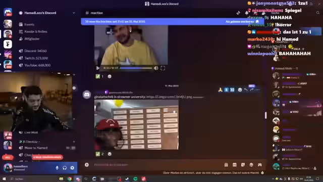 00:34:30Ein weiterer Schwerpunkt ist das Anschauen und Kommentieren von von der Community eingesendeten Videos. Zuerst wird ein Querformat-Edit gezeigt, bei dem der Streamer über seine Verwandlung in einen Vibe spricht. Anschließend wird ein Video gezeigt, das ihn beim Sturz zeigt, bei dem er sich fast den Fuß brach. Er ist verärgert über den Schnitt, da seine echten Schmerzen nicht richtig rüberkommen. Danach berichtet er von einer persönlichen Aktion, bei der er seinem Cousin ein Trikot von seinem Heimatverein Leipzig schenkt, jedoch versehentlich den falschen Marc, seinen Kampfsporttrainer, anschreibt.