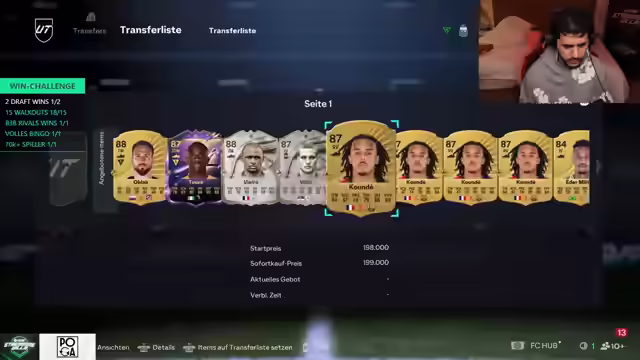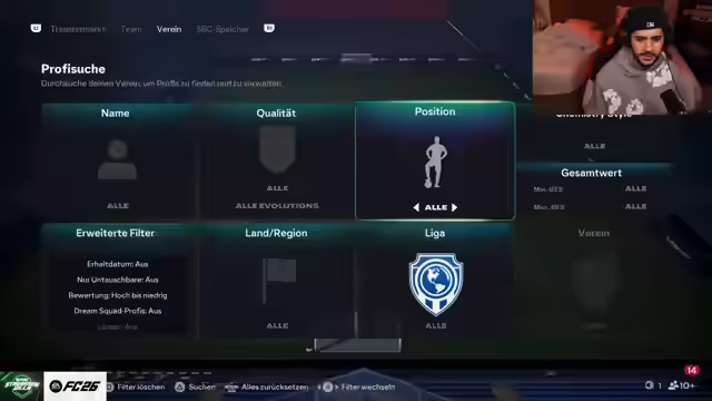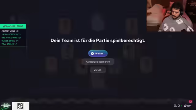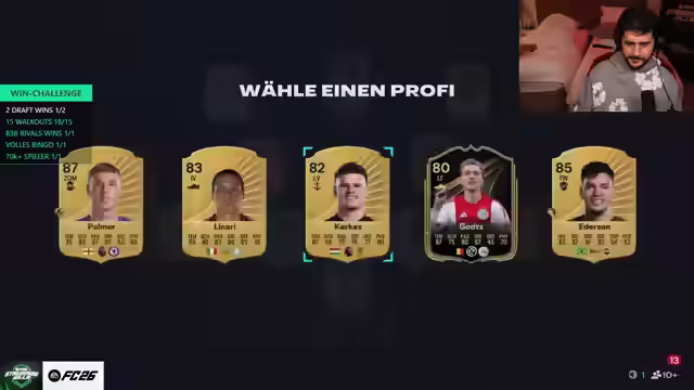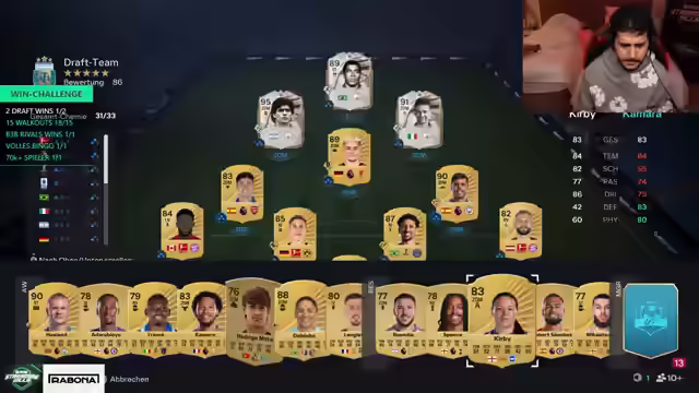 00:01:09Der Streamer startet die Win Challenge in FC 26, trotz Augenringen und wenig Schlaf. Es ist der allerletzte Versuch, das Draft zu schaffen, und er bittet den Chat um Unterstützung. Er spielt mit einer 4-2-2-2 Formation und wählt Spieler wie Carey, Ronaldinho Gaucho und Richarlison aus. Die Tempoanzeigen im Spiel werden als frech empfunden, und er sucht nach geeigneten ZDMs. Nach kurzer WhatsApp-Beratung entscheidet er sich für Nuno Mange als Linksverteidiger und Van de Ven. Es wird Wert auf gute Einwechselspieler gelegt, und Xavi und Frimpong kommen auf die Bank. Kunde wird als Option für die Innenverteidigung in Betracht gezogen. Die Bank wird als Rettung angesehen, und Timber wird als vielseitiger Spieler identifiziert. Es folgt ein weiterer Versuch, das Draft zu meistern, begleitet von epischer Musik und der Aufforderung nach Unterstützung im Chat. Es wird über Probleme im Spiel diskutiert, wie Balleroberungen, die oft wieder beim Gegner landen, und Bouncebacks, die nicht gefixt wurden.