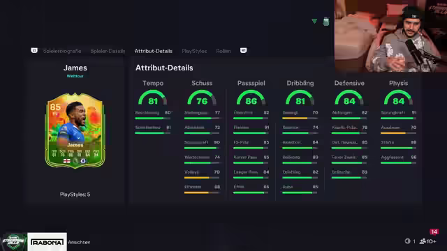 09:13:45Es wird eine Eventkarte von Rhys James vorgestellt, die optisch ansprechend ist. Der Streamer zeigt, wie man ein 80er-Team baut, um eine Aufgabe zu erledigen. Es wird die einfache Bedienung des Assistenten gelobt. Special-Karten werden als optisch sehr ansprechend hervorgehoben. Eine Lucia Rodriguez Karte wird gezeigt. Es wird eine Flashback-Karte von Edin Dzeko vorgestellt, die jedoch nicht sehr ansprechend aussieht. Eine SBC-Herausforderung (Squad Building Challenge) wird vorgestellt, bei der man ein 25k-Pack erhalten kann, wenn man bestimmte Kriterien erfüllt, wie z.B. mindestens drei Länder und maximal drei Vereine im Team zu haben. Es wird kurz überlegt, ob man Silberspieler verwenden soll, aber es werden kaum Silberkarten im Verein gefunden.