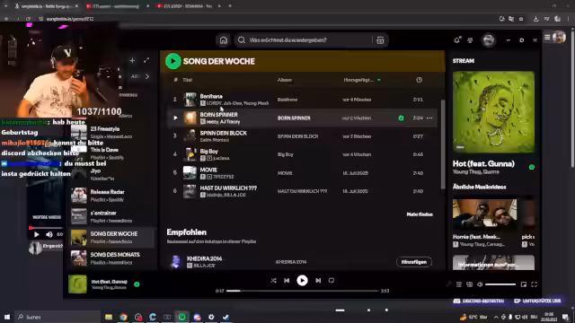 03:52:10Nach einer kurzen Pause startet der Streamer den regulären Teil des Streams mit einer großen 'Song der Woche'-Challenge. Anstatt wie üblich nur die Songs der aktuellen Woche zu bewerten, präsentiert er ein XXL-Battle, das die besten Songs der letzten zwei Wochen gegeneinander antreten lässt. Er erklärt, dass der Twitch-Chat seine Meinung äußern kann, er aber am Ende allein über den Sieger entscheiden wird. Betont wird sein Wunsch nach Ehrlichkeit und Respekt gegenüber den Künstlern, da kritisches Feedback respektlos sein kann, auch wenn jeder einen eigenen Musikgeschmack haben sollte.