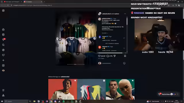 06:25:15Einem Clipper werden Adidas-Fußballtrikots versprochen, die der Streamer gemeinsam im Stream bewertet. Er zeigt eine Auswahl der Trikots für die anstehende WM, darunter Argentinien, Mexiko, Spanien, Belgien und Deutschland. Während ihm die Designs von Italien, Mexiko und Spanien besonders gut gefallen, kritisiert er das deutsche Auswärtstrikot. Er überlegt, ob er sich ein Argentinien-Trikot mit eigenem Namen besorgen soll, und sucht nach der passenden Größe und einem passenden Shop in der Schweiz.