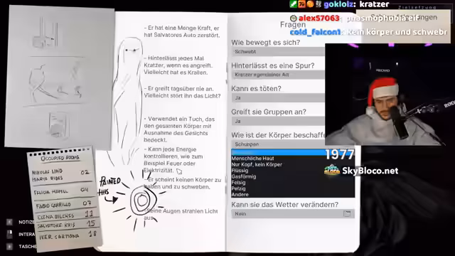 02:22:58Ein Spieler setzt 400 Einheiten ein, wird aber zum Rausgehen aufgefordert. Ein anderer Spieler investiert sechs Einheiten, während Rose All-In geht, um alles zu gewinnen oder zu verlieren. Die Sucht nach dem Spiel wird deutlich, als ein Spieler sogar das Kindergeld seiner Kinder investieren möchte. Das Casino wird als Betrug bezeichnet, und es kommt zu einer humorvollen Auseinandersetzung mit Matze, der als KFC-Mitarbeiter verkleidet ist und die Genehmigung des Casinos in Frage stellt. Es wird festgestellt, dass ein Teil des Casinos kaputt ist, möglicherweise durch einen Wassereimer. Die Spieler werden aufgefordert, das Casino zu verlassen, da sie rausgeschmissen werden. Ein Spieler versucht, Matze ein Geschenk zu machen, während er sich über den kaputten Automaten beschwert. Es kommt zu einer Diskussion über eine angebliche Fake-Donation von 100 Euro, die von Mods stammen soll. Die Gruppe begibt sich zu einem Casino, das vorhin 'voll krass' war, aber jetzt alles verzockt hat. Es wird über die Möglichkeit gesprochen, Diamanten für das Casino zu farmen, und die Spieler werden angewiesen, Matze zu fragen, da er weiß, dass das Geld im Casino bleibt. Es wird festgestellt, dass zwei der drei Automaten im Casino kaputt sind, einer davon durch Rose, die versehentlich einen Wassereimer platziert hat. Die Spieler diskutieren über die besten Tage zum Streamen und die Aktivität des Chats. Es wird versucht, Diamanten zu farmen, während ein Spieler sich in einer Höhle verirrt. Die Gruppe bereitet sich auf ein Horrorspiel namens 'Detective Rainy Day' vor, bei dem alles Wichtige notiert werden muss. Der Streamer plant, vor Mitternacht noch einen Burger zu essen, da er sich selbst neue Essensregeln auferlegt hat. Das Spiel beginnt mit einer Einführung in die Mythologie der iberischen Halbinsel, die Spanien, Portugal und Andorra umfasst. Der Spieler, ein Privatdetektiv namens Iker Carmona, checkt in ein Motel ein und wird von Markus, dem Rezeptionisten, vor wilden Tieren und Aberglauben gewarnt. Das Spiel beginnt mit einem Streit vor dem Motel, den der Detektiv untersuchen soll. Es stellt sich heraus, dass niemand das Motel verlassen kann, da Autos nicht funktionieren, kein Empfang oder Strom vorhanden ist und ein Nebel die Sicht versperrt. Es wird vermutet, dass ein Sturm die Ursache für die Probleme ist, aber die Sache mit den Autos bleibt mysteriös. Der Detektiv befragt die Gäste, um herauszufinden, ob sie etwas Verdächtiges bemerkt haben.