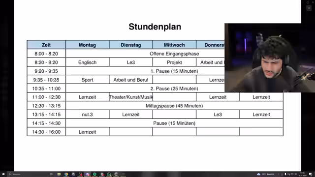 06:54:57Ein von einem Zuschender eingesandter Stundenplan sorgt für große Verwirrung und Aufsehen. Dieser Plan hat extrem viele Pausen und nur wenige Unterrichtsstunden, was den Streamer als besonders ungewöhnlich und unrealistisch bezeichnet. Es wird spekuliert, ob es sich um einen echten Stundenplan handelt oder um einen Scherz. Der Streamer vergleicht den Stundenplan mit einer Grundschule und äußert sich skeptisch über dessen Authentizität.