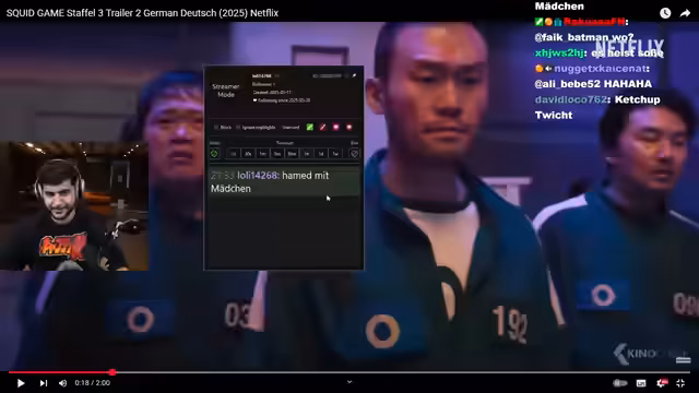 01:01:21Es wird über eine Aussage bezüglich eines angeblich abgenommenen Kiefers von Paluten diskutiert, wobei der Streamer an der Echtheit zweifelt und den Originalclip einfordert. Es folgt eine Reaktion auf die neue Funktion, Bilder zu kommentieren, und ein selbstironischer Kommentar zum eigenen Aussehen. Der Fokus wechselt zu der Ankündigung des Trailers für Staffel 3 von Squid Game, auf die der Streamer sich sehr freut.