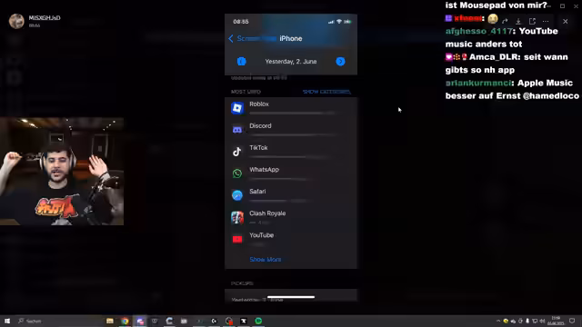 02:07:42Zu Beginn des Streams beschäftigt sich der Streamer mit der Bildschirmzeit eines Chatmitglieds, das extreme Nutzungszeiten auf verschiedenen Apps wie Trade Republic, Reddit und TikTok aufweist. Es kommt zu Spekulationen über dessen Einkünfte und Sozialleistungen, während der Streamer selbst über seine persönliche Situation und bevorstehende Termine, wie eine Fahrt ins Krankenhaus, spricht. Der Stream kündigt zudem ein Minecraft-Comeback an und beginnt mit technischen Vorbereitungen für die Mods.