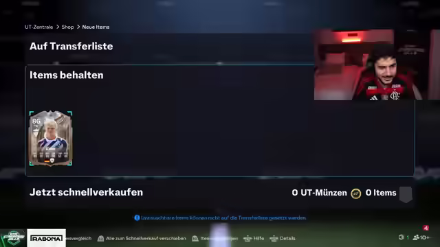 11:06:52Es wird ein Spieler im Wert von 1,5 Millionen gezogen, was zu allgemeiner Aufregung führt. Es wird beschlossen, dass der Spieler, der die Ikone gezogen hat, diese abstoßen muss. Es wird ein Clip von der Aktion erstellt. Es wird über die Höhe des Geldes diskutiert. Es wird eine Rede gehalten und dem Spieler wird kondoliert. Es wird überlegt, ob man es selber machen soll. Es wird überlegt, ob man die Silber abstoßen soll. Es wird der Wert des Spielers mit 1,4 Millionen beziffert. Es wird eine Anekdote erzählt, wie man sich fühlt. Es wird der Clip von der Aktion gezeigt. Es wird sich für den Respekt bedankt. Es wird überlegt, ob man sich das Hemd ausdrucken soll. Es wird überlegt, ob man die SBC abgeben soll. Es wird überlegt, ob man den Spieler zurückholen kann. Es wird überlegt, ob man das Licht anmachen soll.