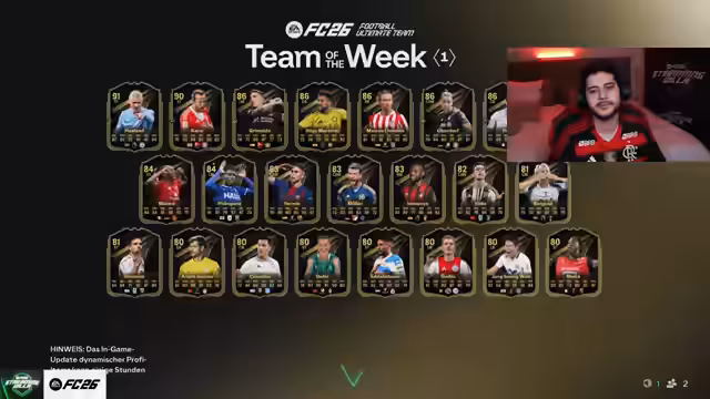 14:09:19Der Streamer arbeitet intensiv an seinem FIFA 26 Team, das er über 600.000 Coins wert schätzt. Er wählsorgfältig Spieler aus und analysiert Statistiken, um ein starkes Team zu formen. Mit seinem Team beginnt er in der Division Rivals, gewinnt sein erstes Spiel und fühlt sich motiviert. Er erwähnt auch den Erhalt verschiedener Pack-Preise und wie sie seine Team-Strategie beeinflussen.