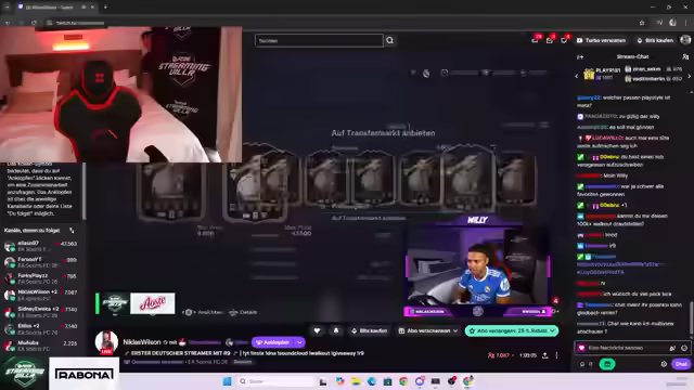 11:30:04Es folgt ein schneller Wechsel von Wappen im Spiel, von Galatasaray zu Paris St. Germain und Besiktas, bevor er sich wieder Paris zuwendet. Es wird überlegt, ob Nationalitäten-Wappen eine Option sind. Es wird die Vorliebe für das Arsene-Trikot mit weiß-olivgrünen (oder rosé-roten) Farben geäußert, ebenso wie für ein weiß-grünes Bayern-Trikot. Es wird kurz überlegt, ob ein solches Trikot als reales Kleidungsstück benötigt wird. Kurz darauf wird der Spieler Isak gezogen, was zu großer Freude führt. Es wird diskutiert, dass es zwei Versionen von Isak im Spiel gibt. Der Streamer äußert den Wunsch, dass Pia einen Eder Militao zieht und dazu passende Musik abspielt, verwirft die Idee aber aufgrund möglicher Urheberrechtsprobleme und eines drohenden Banns. Kurz darauf bedankt sich der Streamer bei einem Zuschauer für ein Jahr Mitgliedschaft und entschuldigt sich für sein Verhalten.