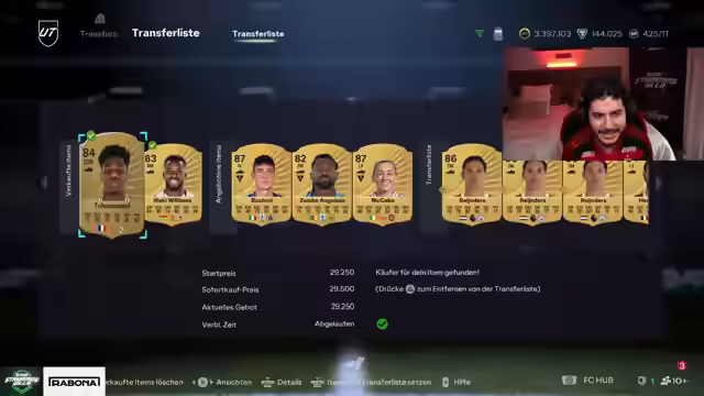 03:28:48Es wird bekannt, dass der Bruder als Manager fungiert und ein neuer Deal abgeschlossen wurde, der aber nicht näher erläutert wird. Die Community wird aufgefordert, auf Instagram Nachrichten für Teambewertungen zu schicken und anzugeben, wie viele Coins vorhanden sind. Es wird darüber diskutiert, ob man angeben sollte, ob man aufgeladen hat oder RTG ist. Es wird angeboten, beim Teambau zu helfen, wobei erwähnt wird, dass drei Millionen Coins zur Verfügung stehen. Die Idee einer FIFA Bingo-Challenge wird aufgegriffen. Es wird überlegt, ob man Kilian Mbappé verkaufen soll und ob man es einem Kollegen günstiger verkaufen soll. Es wird darüber gesprochen, wie man traden kann und wo man Informationen dazu findet. Es wird überlegt, welche Spieler man kaufen soll, wobei auch auf die Preise und Statistiken eingegangen wird.