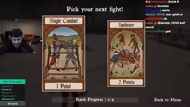 09:40:05Trotz der Frustration hat der Streamer Erfolg in 'Half Sword'. Er schafft es, mehrere Gegner in 1-gegen-1-Kämpfen zu besiegen und freischaltet den nächsten Rang 'Soldat'. Er fühlt sich im Spiel sicherer und findet bestimmte Waffen, wie den Speer, sehr effektiv. Dennoch bleibt 'Grete' ein ständig auftauchendes und äußerst schwieriges Hindernis, das ihn oft am Erreichen des Ziels hindert.